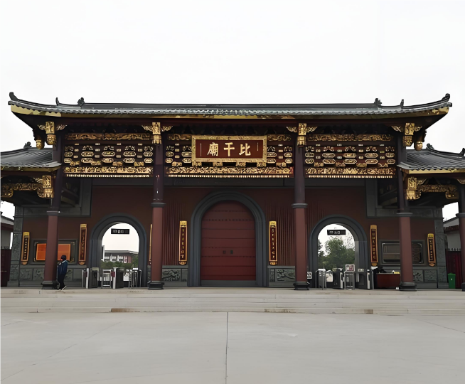 畢干宮雕像是由漢白玉制成的,高4米。拱門大多是木制或石頭建筑。其中,單鑫牌樓位于比干廟中軸線上,共4柱7層、高9米、面闊16米。額方刻有龍鳳圖案,正面匾額由原國防部部長張愛萍將軍題寫“赤膽忠心”四字。
