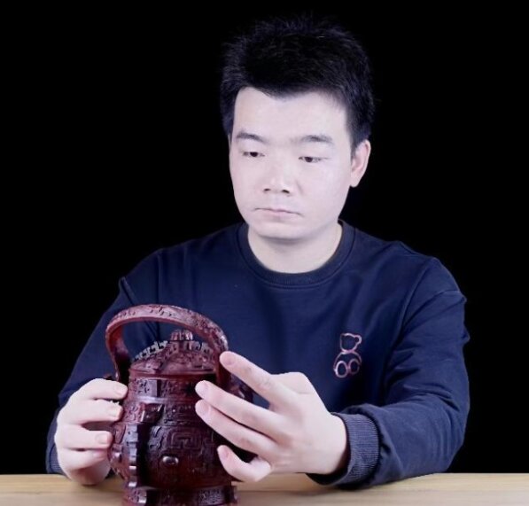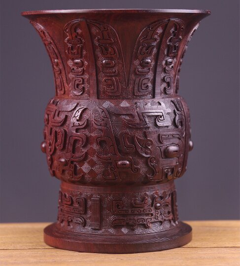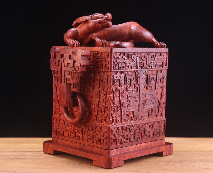創(chuàng)作設(shè)計:尊,在古代多為青銅制,主要用于盛裝美酒,也是中國古代青銅器的重要器皿之一,也是古代王公貴族所擁有的,象征著其地位的尊貴,也是古代祭司時所用的重要禮器,特別受古人尊重,因此“尊”字又引用出尊重、尊貴、尊敬等由尊而起的詞,并沿襲至今。今用小葉紫檀,青銅化木制器,致敬古代匠人超高的技術(shù)水平和匠人精神。作品選用上好的小葉紫檀一木成器,在商周青銅紋飾的基礎(chǔ)上結(jié)合現(xiàn)代手工刀具使其紋飾更具立體感,紋理更加細(xì)膩整潔。然因是木制,雖不具備盛裝美酒,亦可當(dāng)做筆筒使用,既是一件藝術(shù)品擺件,也是一件極具美感的實用器。