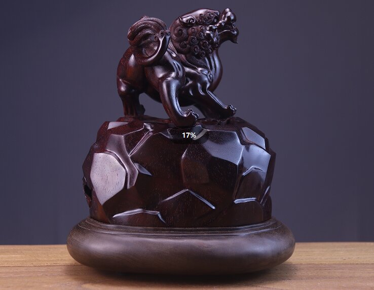 創(chuàng)作設(shè)計:狻猊香薰,作品分兩部分,上為蓋,下為底,蓋由紫檀制,創(chuàng)作思路,利用材料的自然空洞做為香薰的煙道,上刻一尊昂首挺胸神獸狻猊,狻猊是中國古代神話中的神獸,也是龍生九子中的第五子,其形似獅,喜煙火,常被用來裝飾在香爐上,也是佛或菩薩的坐騎,護(hù)法獸。揭開上蓋,其下為底,底用金絲楠陰沉木制,水波紋理波光粼粼,上置防火棉,點盤香,整體意境表現(xiàn)甚佳,在佛教中供奉狻猊可以增加福報和功德。