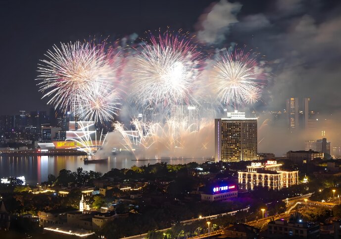 規模與效果:總燃放量達153,800發,創新采用高空與中低空煙花融合表演,畫面寬度從500米延伸至650米。
